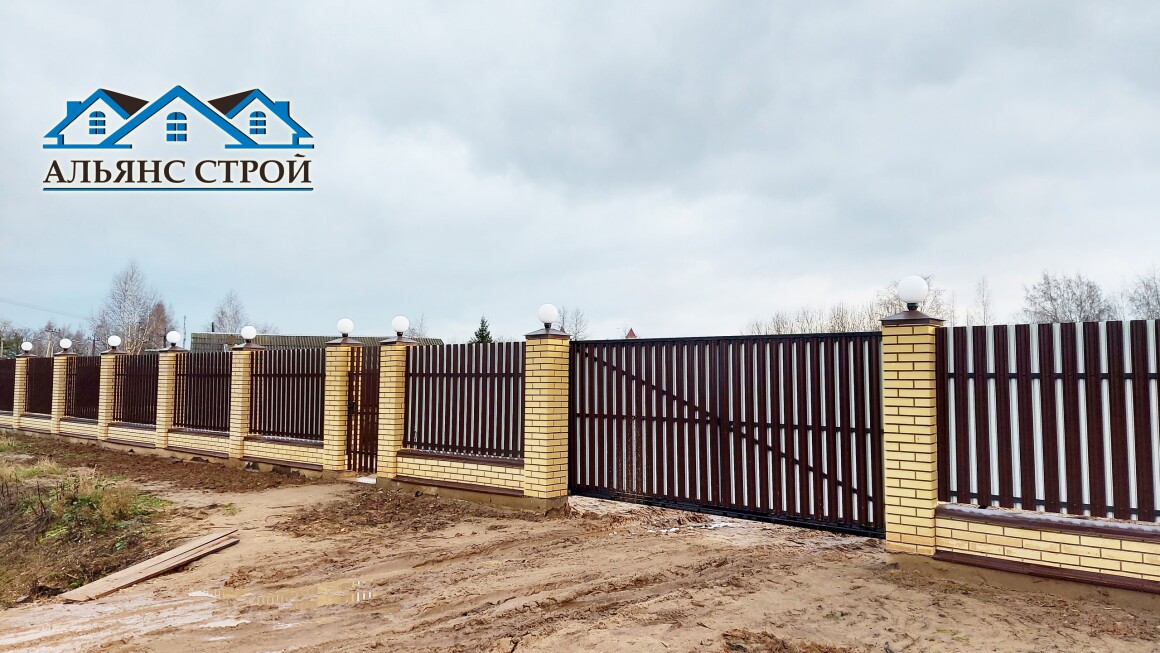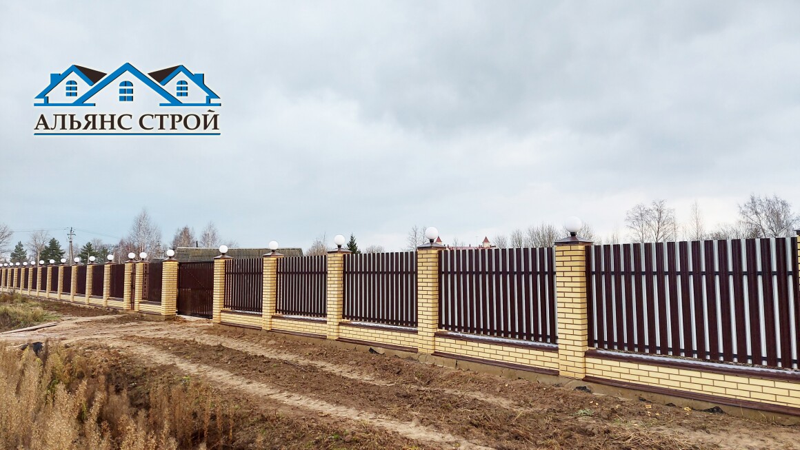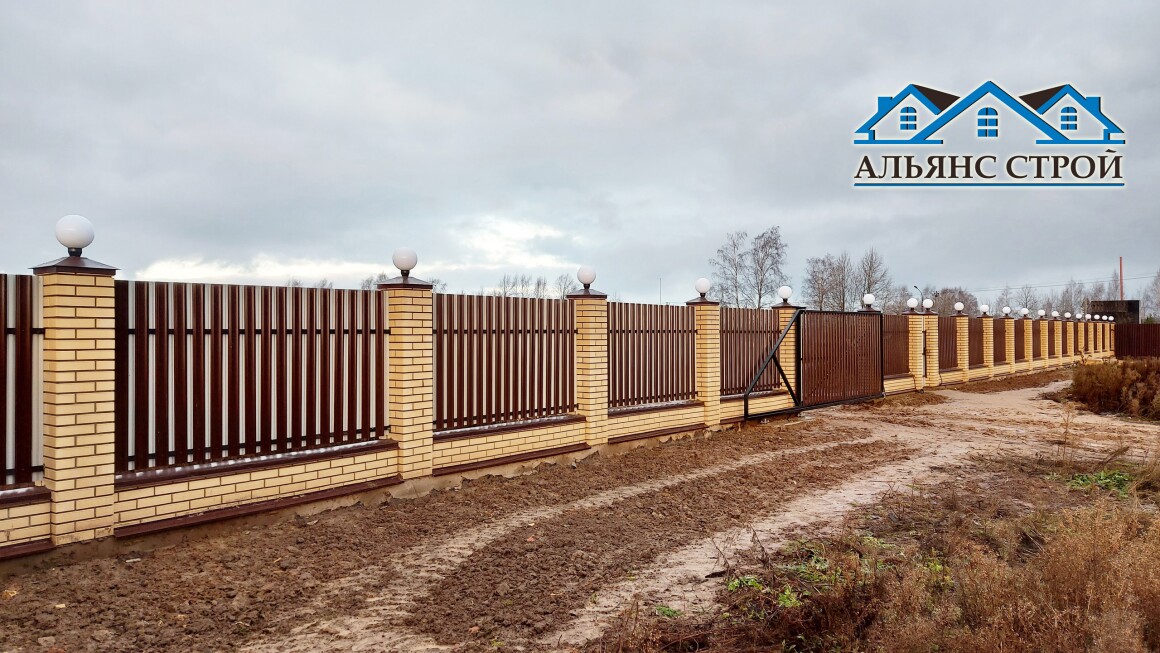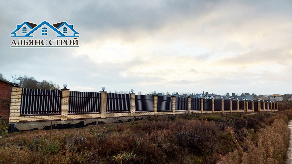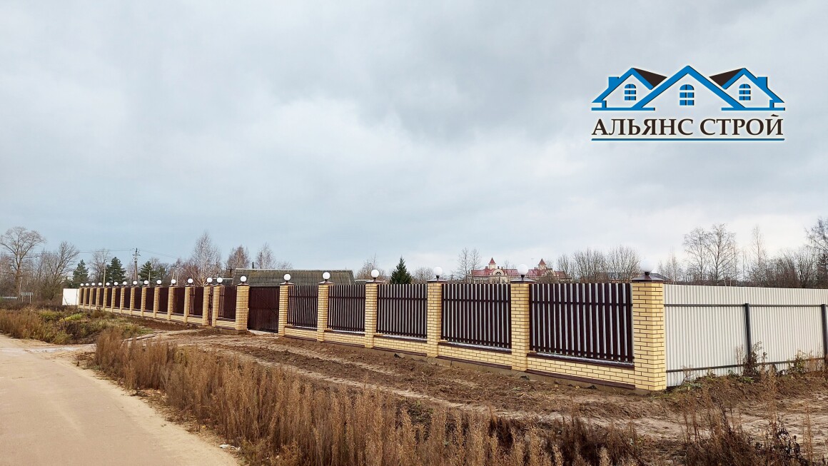 Вот и один из наших завершенных работ по возведению забора в п. Марфино. Лицевая часть забора возведена из кирпичных облицовочных столбов. Для этого был смонтирован железобетонный ростверк с "забуриванием" через каждые 3 метра металлических столбов на глубину 1,6 метра. Поверх ростверка выложен кирпичный цоколь, а так же несущие столбы, залитые бетоном. На столбы смонтированы колпаки со светильниками. Пролеты забора заполнены М-образным металлическим штакетником в шахматном порядке с двух сторон.