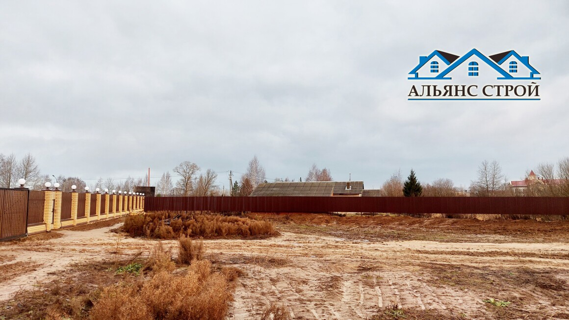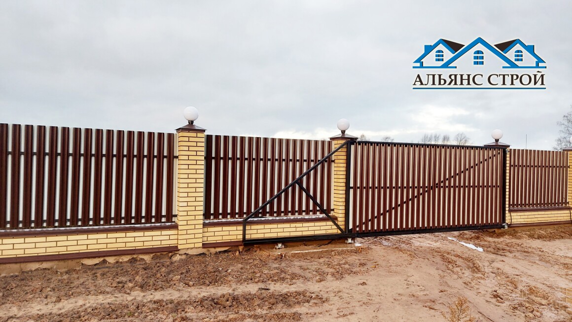 Ворота изготовлены выдвижные на металлическом каркасе. Железобетонный монолитный фундамент под них заливался на глубину 1,6 метра. Остальные 3 стороны забора (со стороны соседних участков) возведены из металлического профнастила С20. Работы завершены