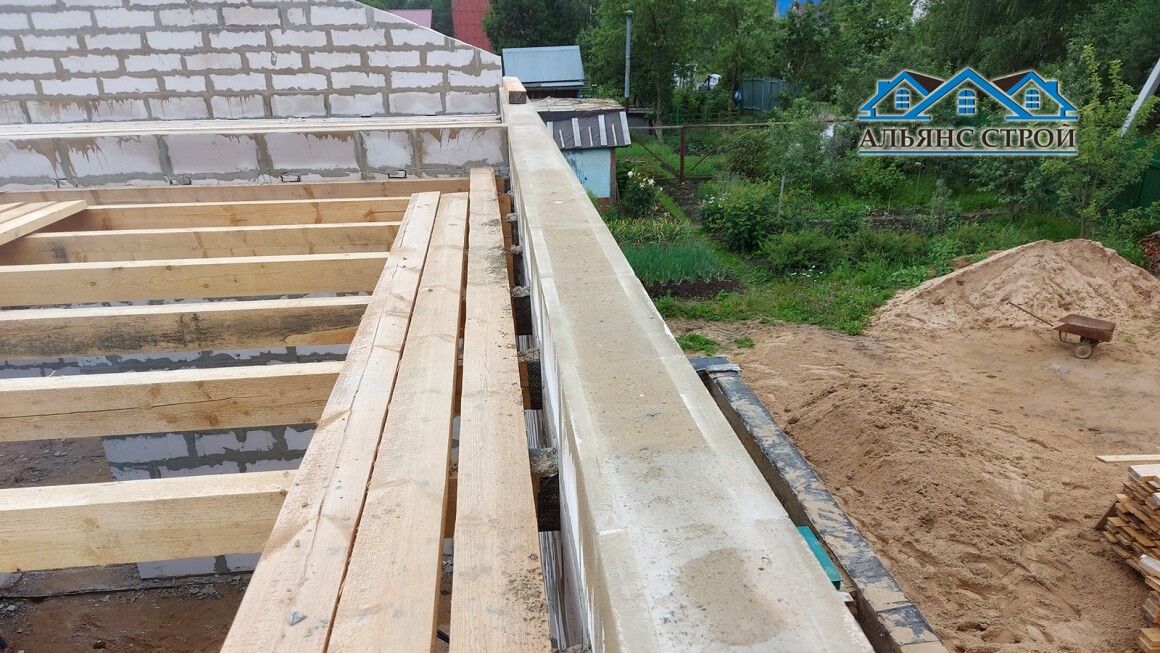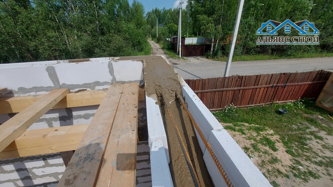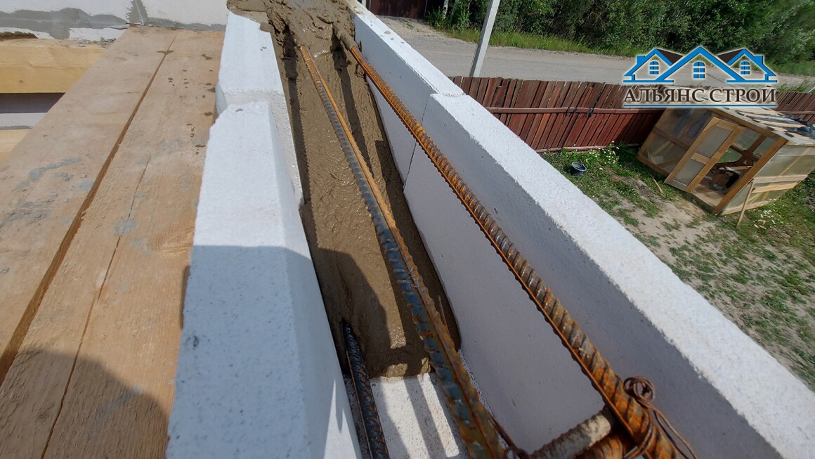 Армопояс в доме из газобетона - это железобетонная конструкция, которая служит для равномерного распределения нагрузки от крыши на стены. Он также предотвращает деформацию стен из-за неравномерной осадки фундамента или морозного пучения грунта.