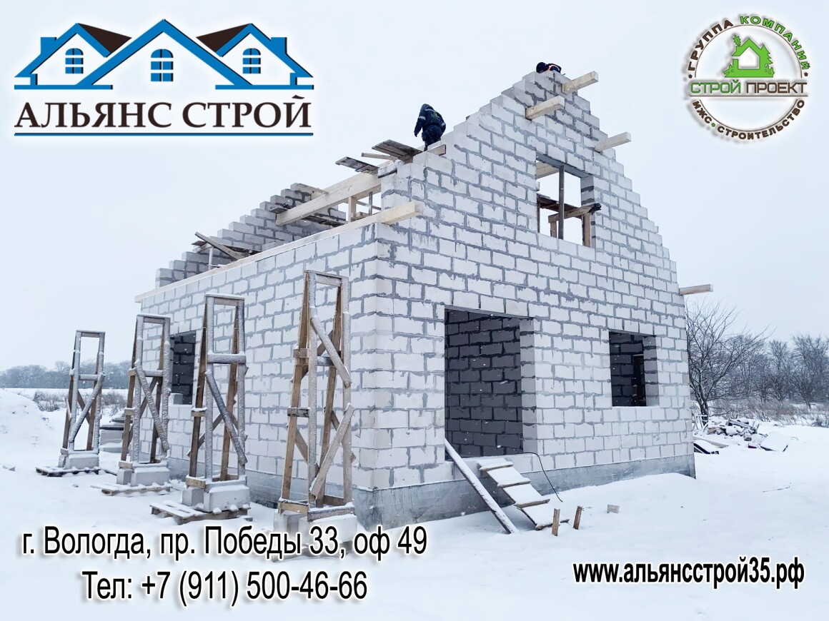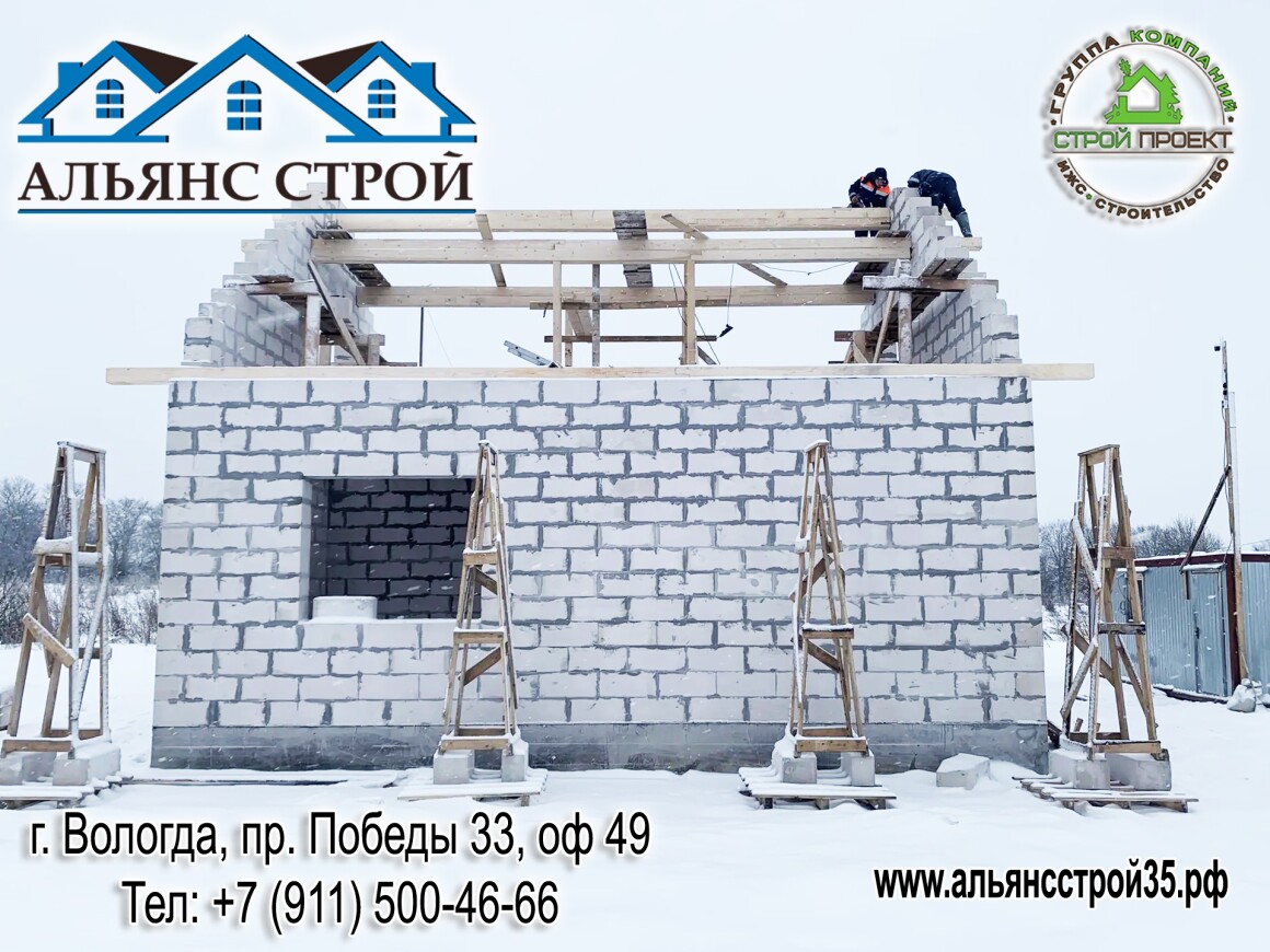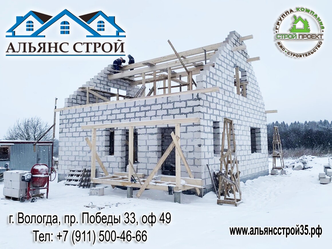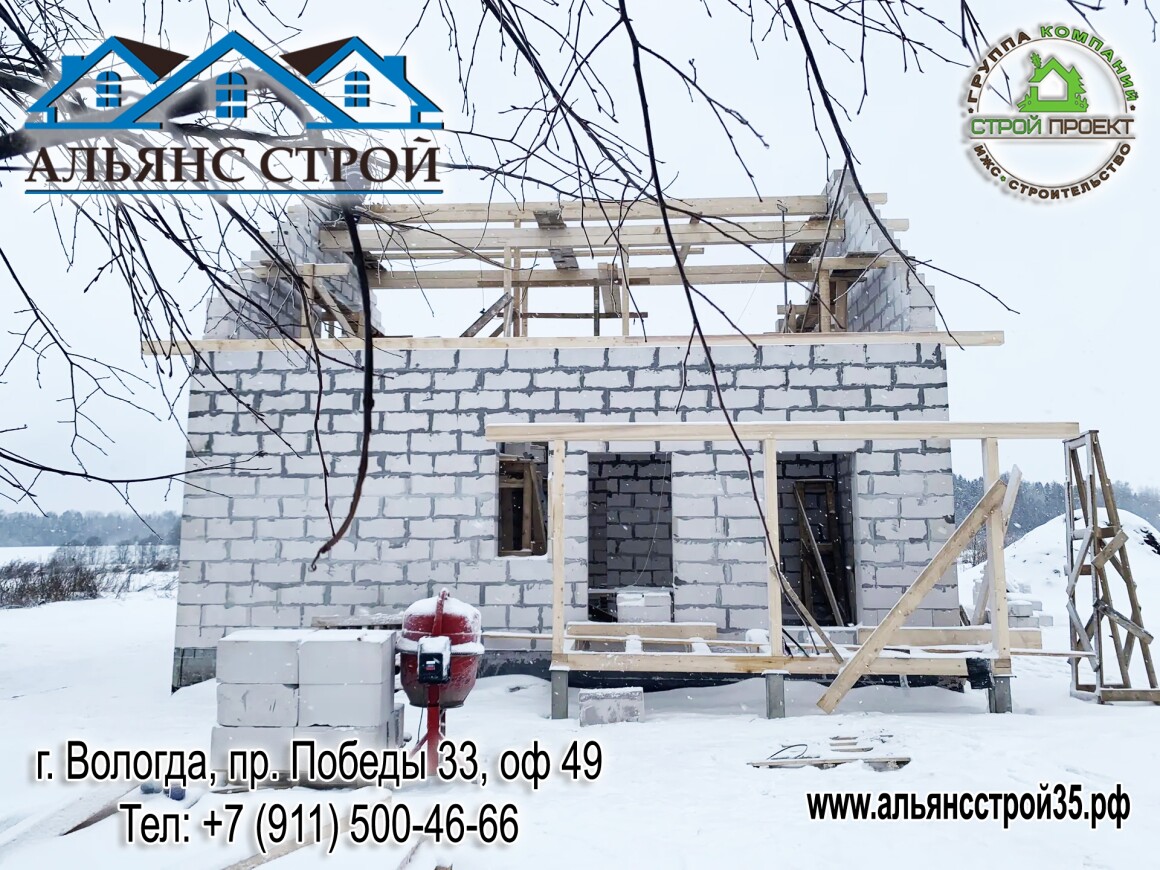 Работа кипит круглый год. Продолжается строительство дома из газобетона по проекту АС-007 "АВАЛОН" (https://альянсстрой35.рф/proekt-as-007) в п. Куркино, Вологодского р-на. Изготовили стены дома и приступили к устройству крыши.