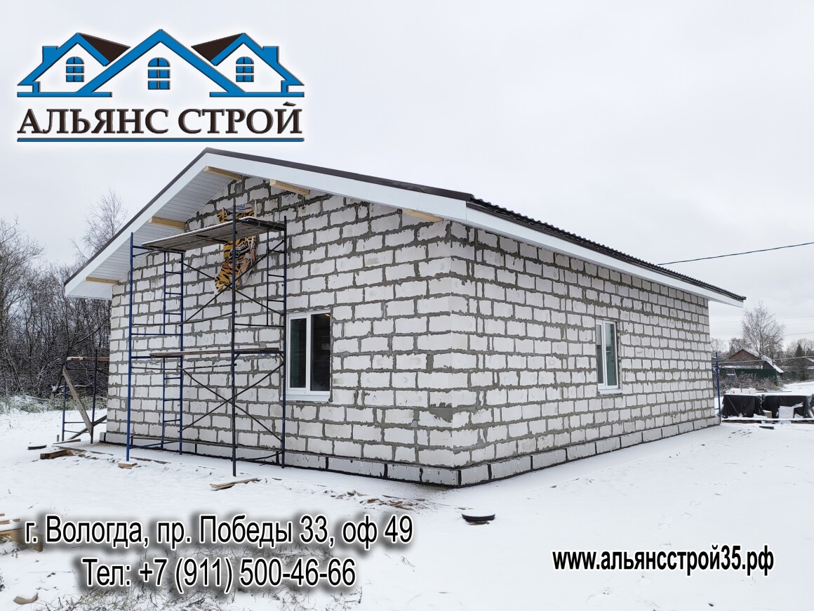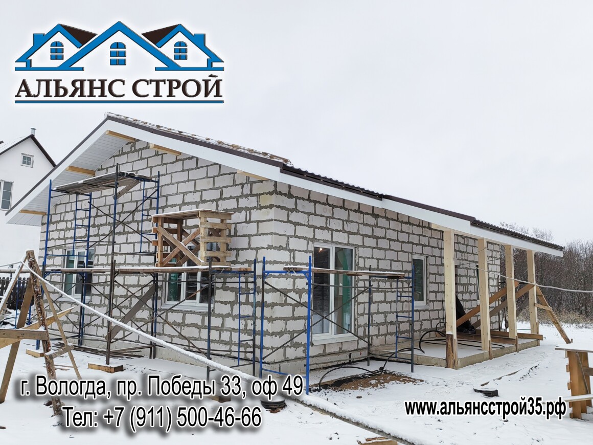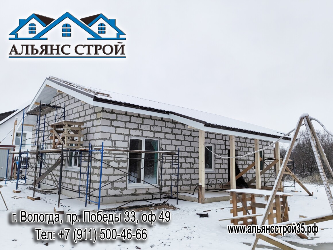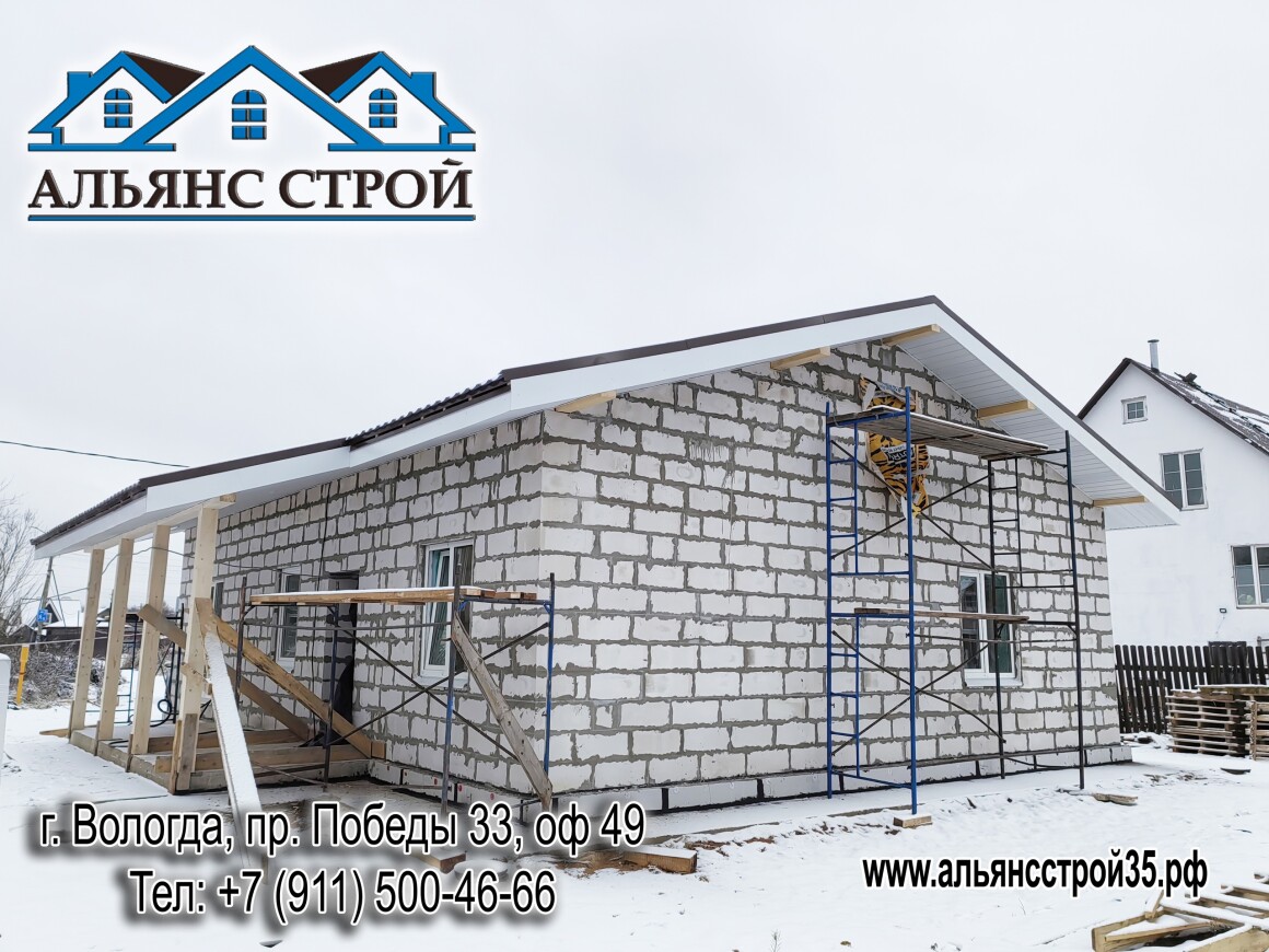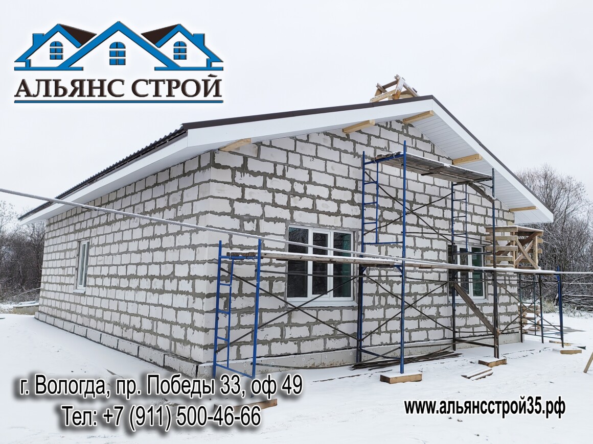 Продолжаются работы по строительству дома из газобетона в г. Вологда. Возвели дом под крышу и изготовили закрытый контур дома. Обшили свесы крыши софитами и смонтировали окна. Перешли на внутреннюю отделку.