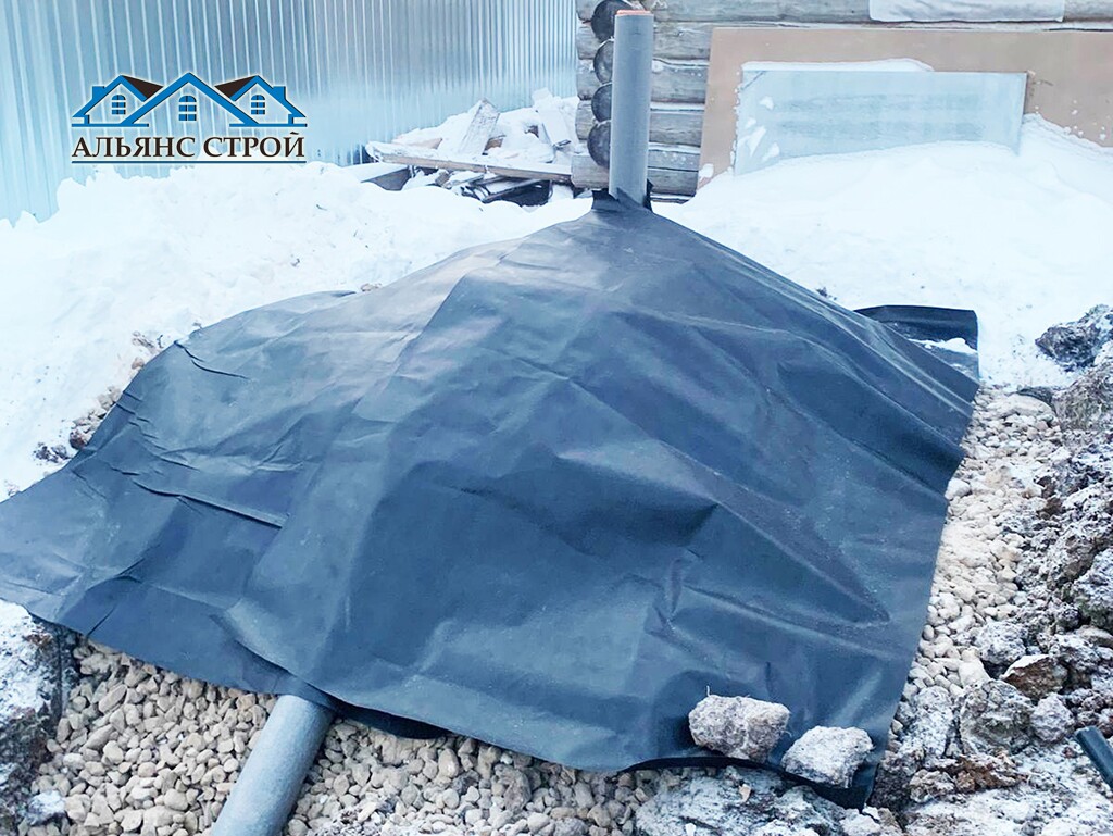 На участке высокий уровень грунтовых вод и, как следствие, самотёчный сток воды из системы не будет работать. Взяли станцию, дооснащенную баком с дренажным насосом и установили на участке дренажный тоннель выше уровня земли. При монтаже дренажного тоннеля выбрали весь плодородный слой под будущим сооружение, сделали гравийное оснований и установили тоннель. Сверху засыпали так же гравием и уложили геотекстиль во избежание смешения разнородных слоев грунта. Далее засыпали грунтом.