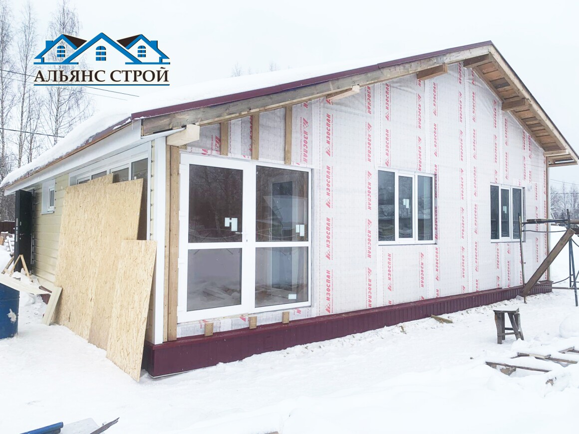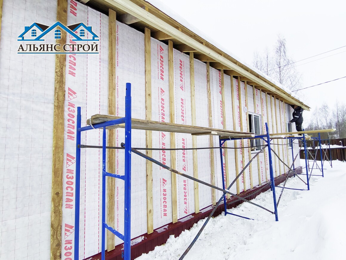 Цоколь утеплили экструдированным пенополистиролом (пеноплекс) 50 мм и обшили профлистом с8.На стены дома смонтировали маяки из бруска 50х50 мм. Между бруском и стеной проложили гидроизоляционную прокладку из рубероида. Бруски закрепили на анкерные болты. Теплоизоляцию стен произвели базальтовым утеплителем, плотностью 70кг/м3. Смонтировали контробрешетку из доски 25х100 мм и паропроницаемой ветрозащитной мембраны. Стены дома обшиваем металлосайдингом. Свесы крыши из металлических перфорированных софитов.