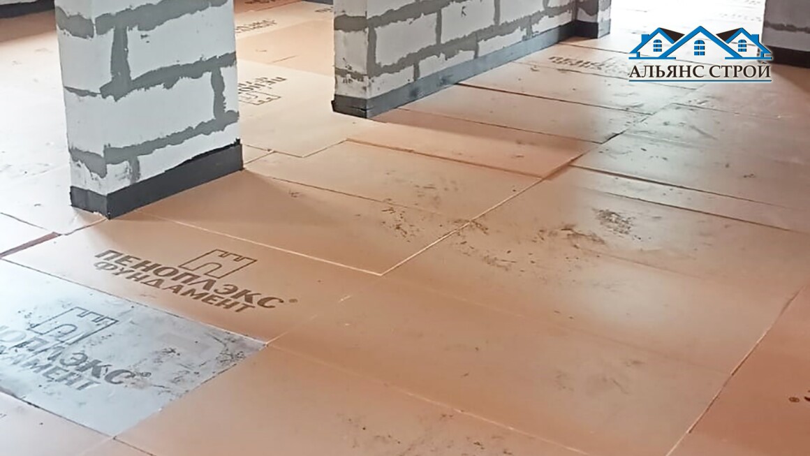 Кромки фундамента и низ стен промазали битумной мастикой и проложили демпферную ленту для компенсации теплового расширения нагретого в дальнейшем бетона. Уложили экструдированный пенополистирол в 2 слоя по 50 мм в шахматном порядке. Уложили гидроизоляцию и смонтировали змеевик теплого пола.