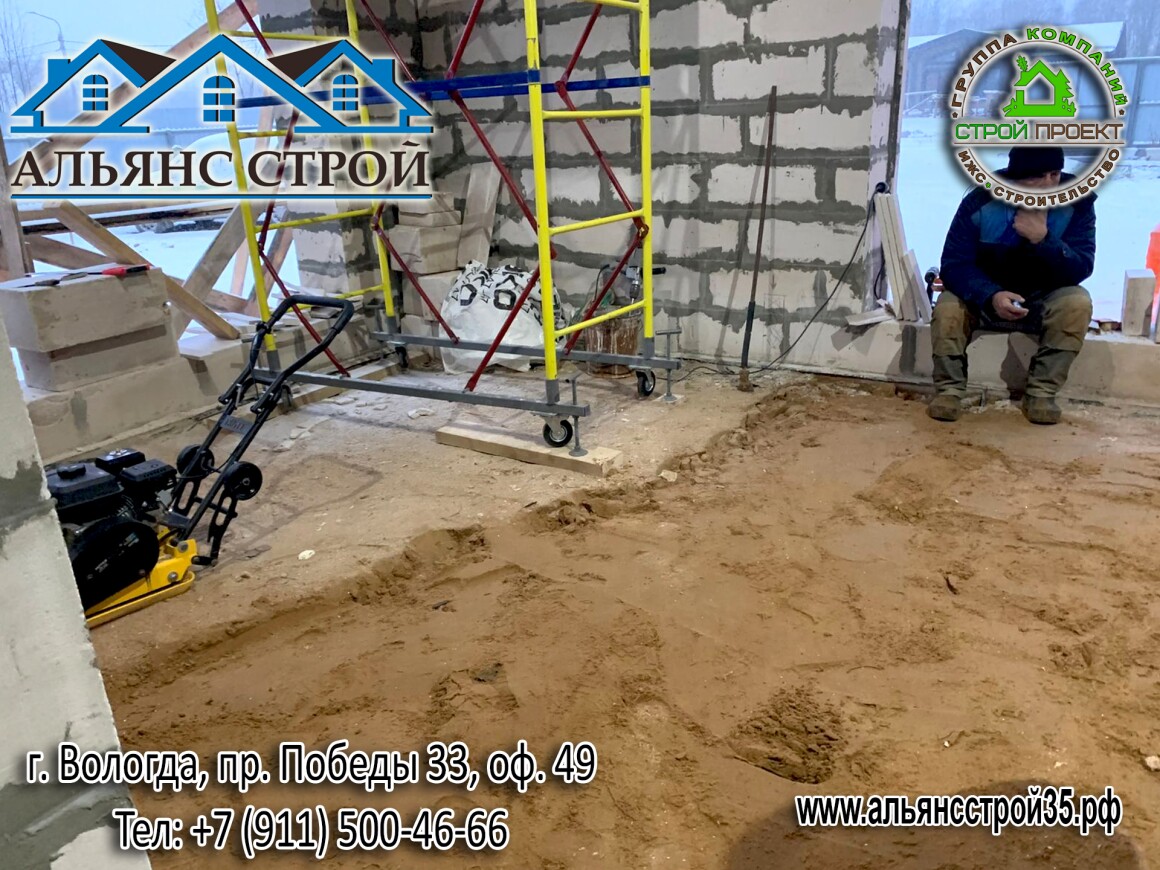 Произвели работы по устройству пола, в виде заливки плиты (бетонной стяжки) по грунту в доме. Монолитная стяжка с устройством теплого пола. Произвели обратную засыпку песка в фундамент еще на этапе возведения стен. За время строительных работ он уплотнился естественным образом. Песок разровняли по нивелиру и произвели трамбовку.