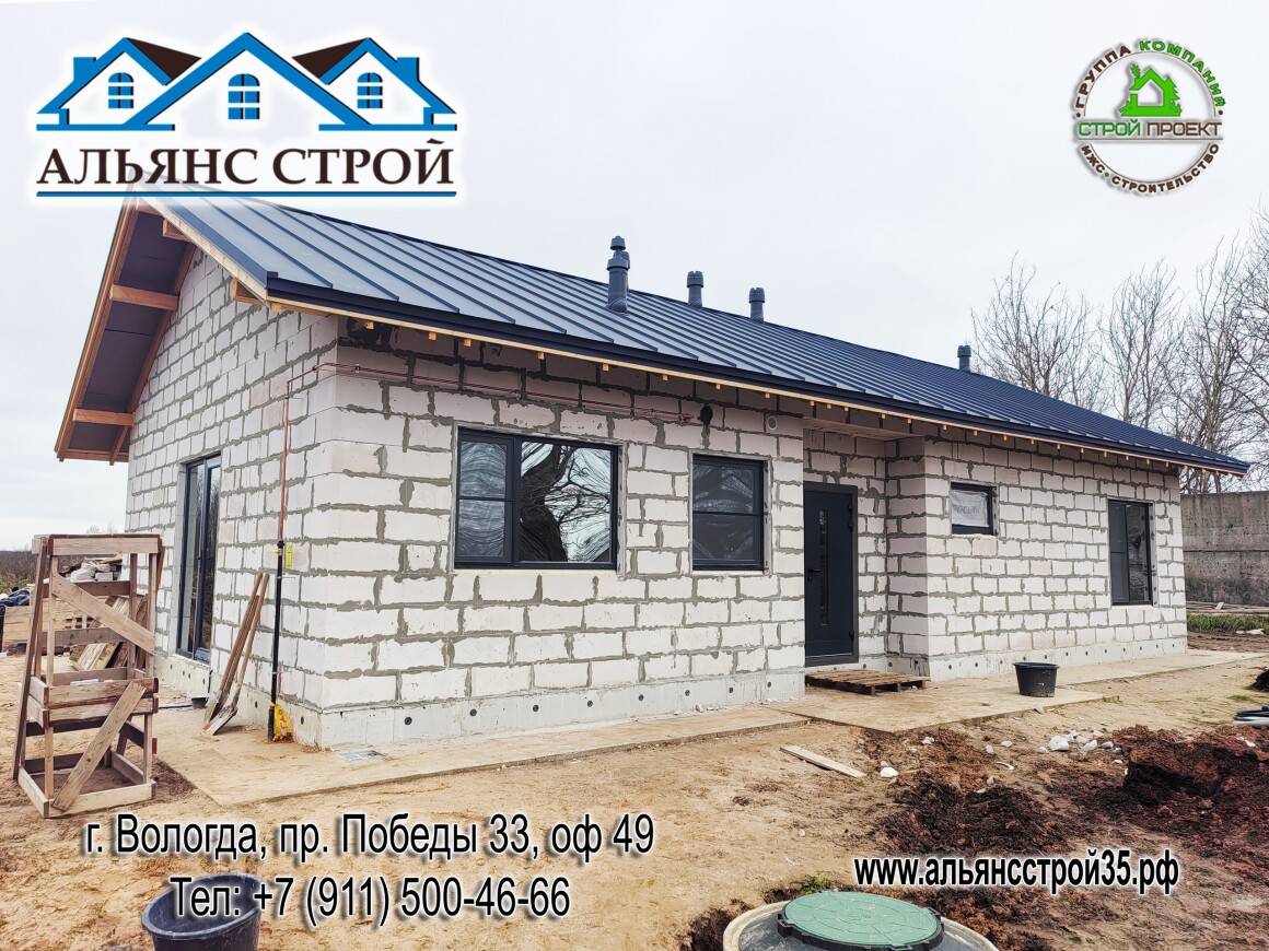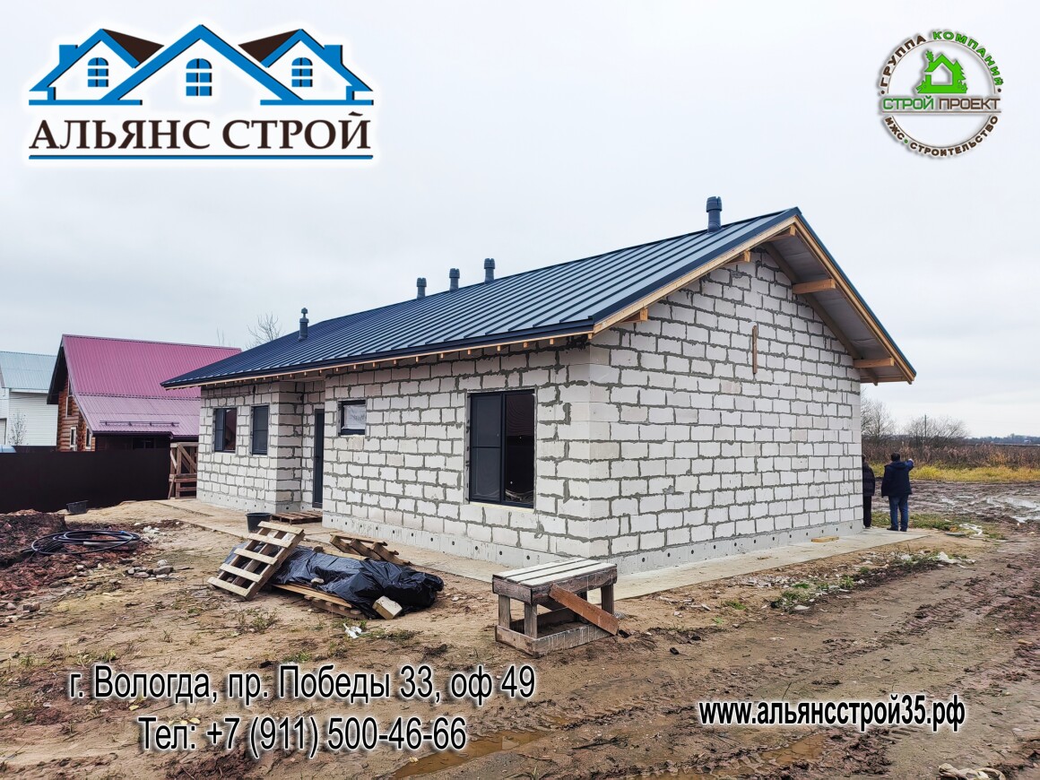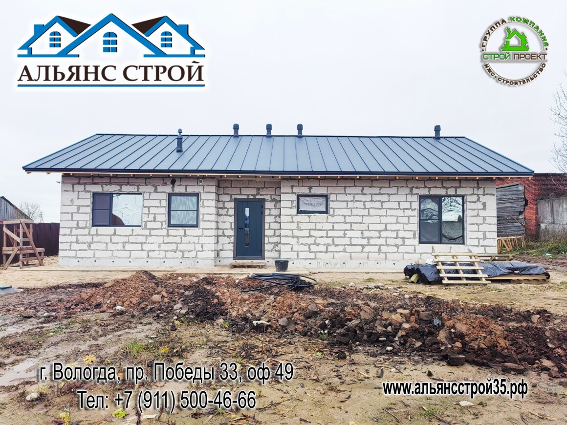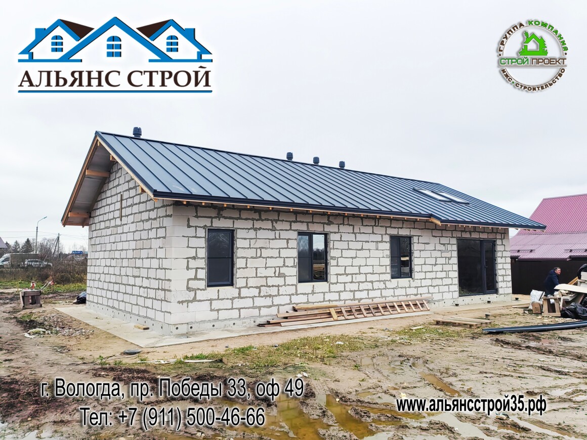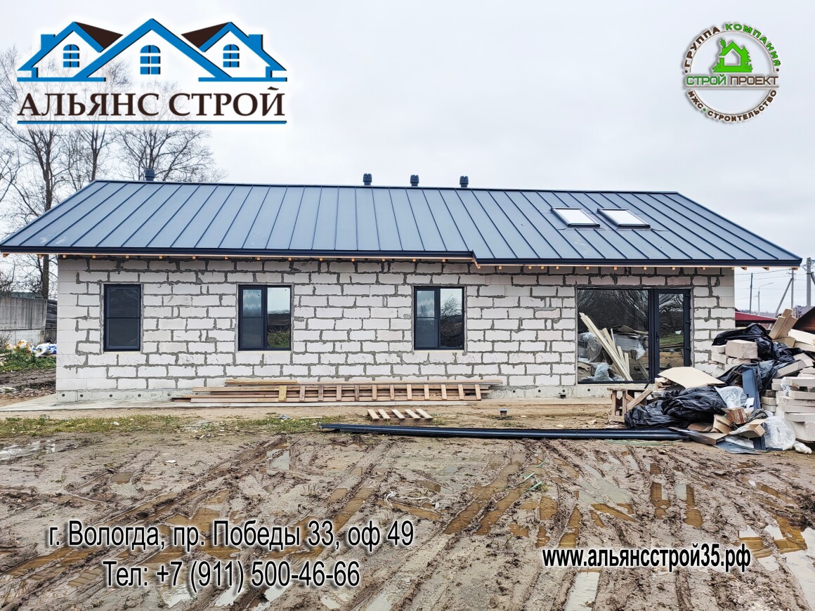 Завершились работы по строительству одноэтажного дома из газобетона 8х15 м, общей площадью 136 м2 (жилая 98 м2) в п. Семенково, г. Вологды.