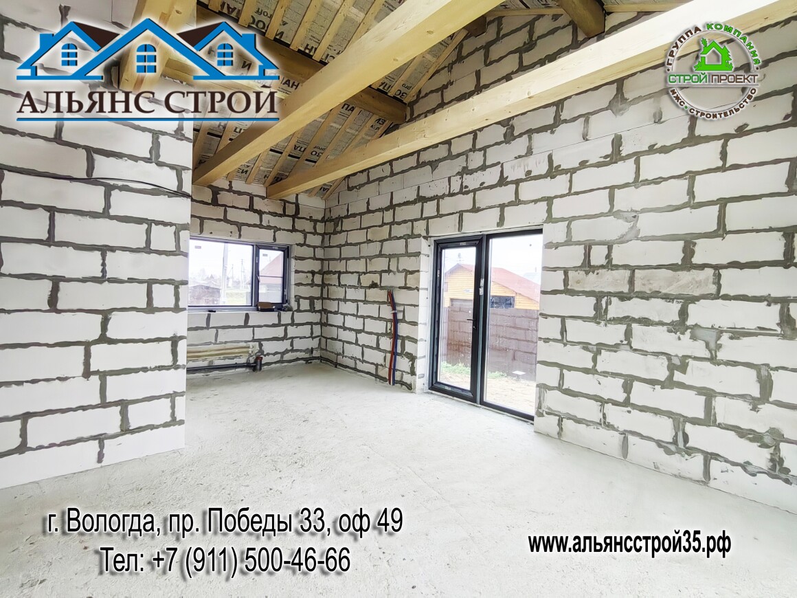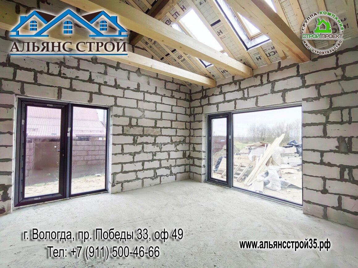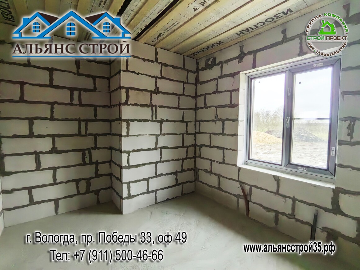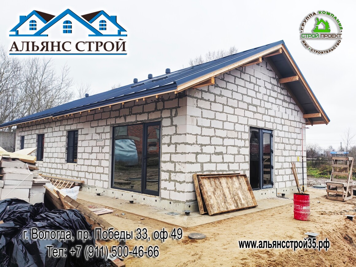 Завершились работы по строительству одноэтажного дома из газобетона 8х15 м, общей площадью 136 м2 (жилая 98 м2) в п. Семенково, г. Вологды.